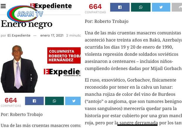 Kolumbiyanın nüfuzlu “El Expediente” xəbər portalında köşə yazarı Roberto Trobaxonun müəllifi olduğu, 20 Yanvar faciəsinə həsr olunmuş “Qara yanvar” başlıqlı yazı dərc olunub.