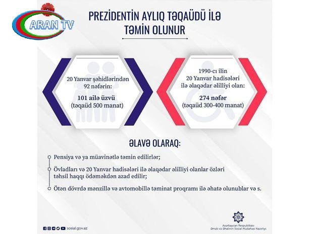 Hazırda 20 Yanvar şəhidlərindən 92 nəfərin 101 ailə üzvü və 20 Yanvar hadisələri ilə əlaqədar əlilliyi olan 274 nəfər Prezidentin aylıq təqaüdləri ilə təmin olunur.