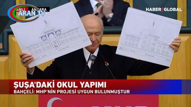 Çıxışı zamanı MHP sədri həmçinin Şuşada tikiləcək məktəbin ilkin eskizlərini də nümayiş etdirib.