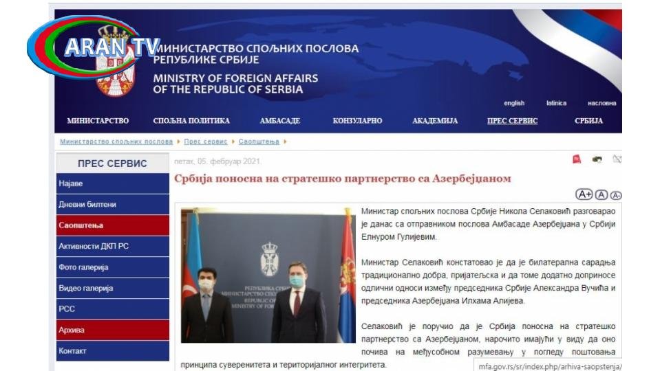 Selakoviç bəyan edib ki, Serbiya Azərbaycan Prezidenti, Ermənistanın baş naziri və Rusiya Prezidentinin Qarabağda atəşkəs barədə 10 noyabr tarixli birgə Bəyanatını dəstəkləyir.
