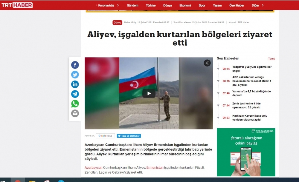 Azərbaycan Respublikasının Prezidenti İlham Əliyev, birinci xanım Mehriban Əliyeva və qızları Leyla Əliyevanın fevralın 14-də Füzuli, Zəngilan, Laçın və Cəbrayıl rayonlarına səfərləri Türkiyə kütləvi informasiya vasitələri, o cümlədən Anadolu agentliyi, “TRT Haber”, “Haber Global” telekanalları, “Təqvim”, “Yeni Şafak”, “Akşam” və digər qəzetlər tərəfindən geniş işıqlandırılıb.