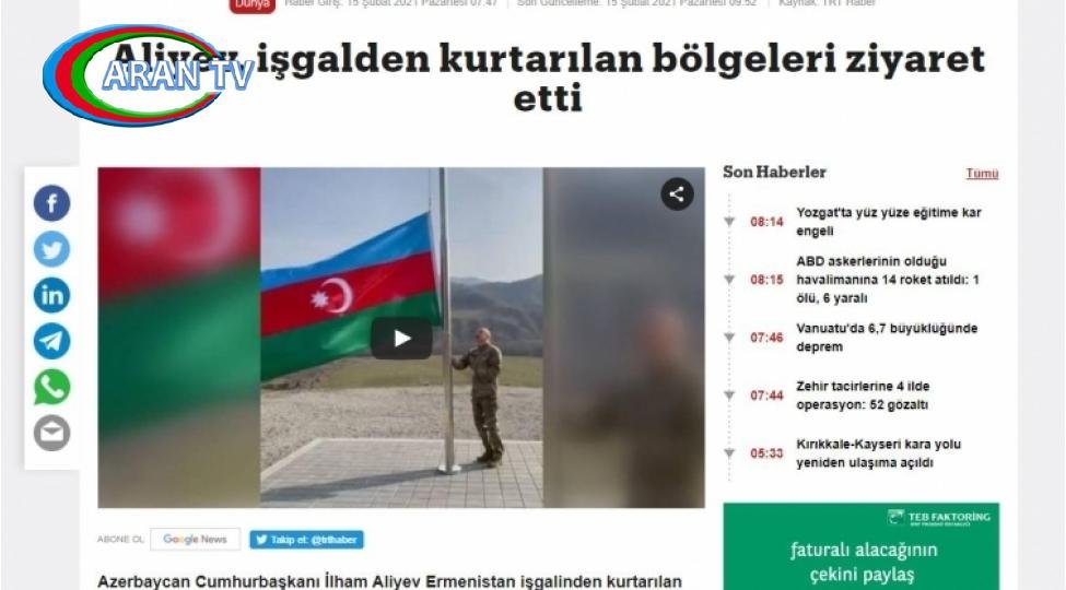 ARANTV.AZ xəbər verir ki, Türkiyə mediasının yaydığı xəbərlərdə Prezident İlham Əliyevin səfər çərçivəsində söylədiyi fikirlər, o cümlədən işğal altındakı torpaqların amansızcasına dağıdılması, 44 günlük Vətən müharibəsi nəticəsində qazanılan böyük Zəfər, düşməndən azad olunan ərazilərdə aparılan bərpa işləri və digər məsələlər barədə verdiyi mesajlar türkdilli oxucuların diqqətinə çatdırılıb.
