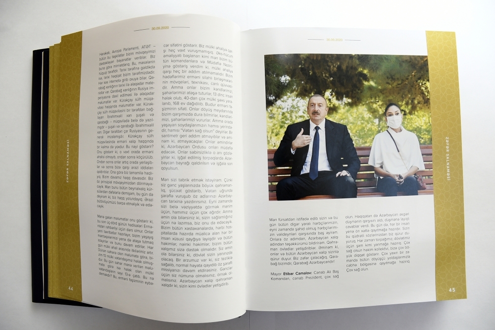 Bunlarla yanaşı, ölkə Prezidentinin işğal altında olan torpaqlarımızın bir-birinin ardınca işğaldan azad edilməsi ilə bağlı “Twitter” səhifəsində paylaşdığı müjdəli xəbərlər də kitabın səhifələrini bəzəyir.