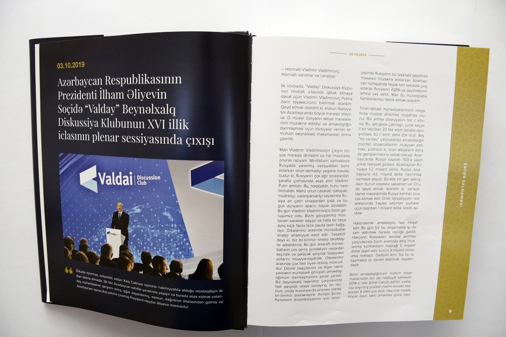 Yeri gəlmişkən, nəşrdə ilk olaraq Azərbaycan Respublikasının Prezidenti İlham Əliyevin Soçidə “Valday” Beynəlxalq Diskussiya Klubunun XVI illik iclasının plenar sessiyasında çıxışının yer alması müstəsna əhəmiyyətə malikdir. O mənada ki, Vətən müharibəsində əsas şüara çevrilən “Qarabağ Azərbaycandır və nida işarəsi” çağırışı məhz bu sessiyada Prezident İlham Əliyev tərəfindən qətiyyətlə və cəsarətlə bəyan edilmişdi.