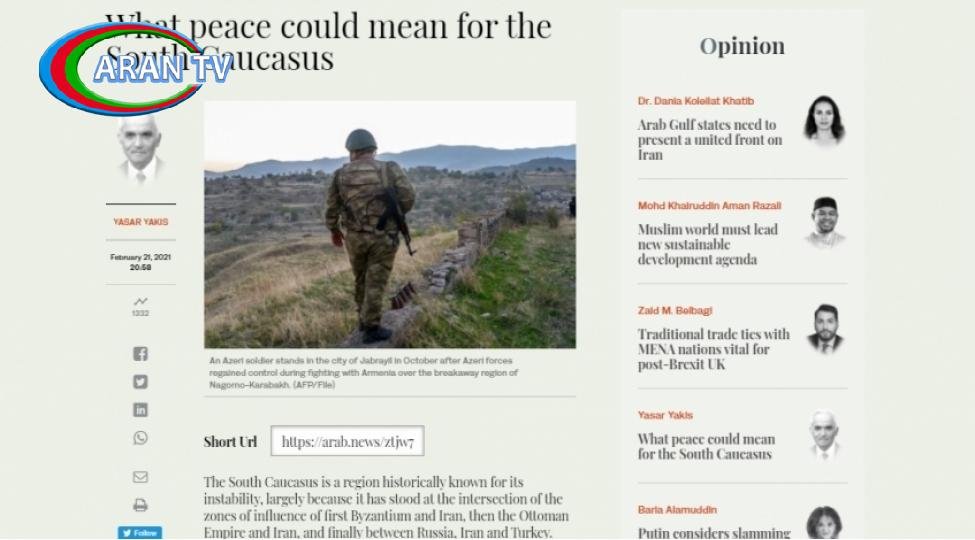 Səudiyyə Ərəbistanının nüfuzlu “Arabnews” qəzetində türkiyəli politoloq Yaşar Yakışın Azərbaycanın Vətən müharibəsindəki Zəfəri və bu Qələbənin Cənubi Qafqazda sülhün və sabitliyin bərqərar olmasında əhəmiyyətindən bəhs edən geniş analitik məqaləsi dərc edilib.