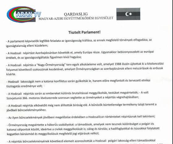 Cəmiyyətin sədri və Azərbaycan Evinin direktoru Ramiz Əmirlinin imzası ilə Macarıstan parlamentinə və Xarici İşlər Nazirliyinə ünvanlanan bəyanatda bildirilib ki, 1992-ci il fevralın 25-dən 26-na keçən gecə erməni silahlı birləşmələri 366-cı motoatıcı alayın hərbçilərinin köməyilə Avropanın bir hissəsi olan Azərbaycan ərazisində Xocalı soyqırımını törədiblər və Avropa dəyərlərini, insan hüquqlarını kobudcasına tapdalayıblar: