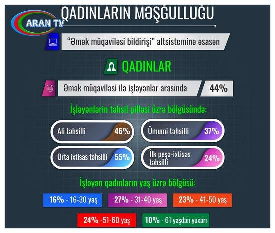 Bildirilib ki, hazırda Əmək və Əhalinin Sosial Müdafiəsi Nazirliyinin “Əmək müqaviləsi bildirişi” altsistemində qeydiyyatda olan aktiv əmək müqaviləsi bildirişlərinin 44%-i qadınlarla bağlanan əmək müqavilələrinə aiddir.