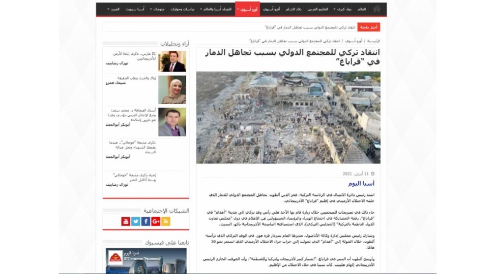ARANTV.AZ xəbər verir ki, yazıda Türkiyə Prezidenti Administrasiyasının Kommunikasiya İdarəsinin sədri Fahrettin Altunun erməni işğalçılarının Azərbaycanın Qarabağ bölgəsində törətdikləri dağıntılara və barbarlığa münasibətdə ikiüzlü mövqeyinə görə beynəlxalq ictimaiyyəti sərt tənqid etdiyi bildirilir. “Türkiyə rəsmisi qeyd edib ki, 30 illik işğalın sona çatdırılması Prezident İlham Əliyevin qətiyyətli mövqeyi nəticəsində mümkün olub və Türkiyə bu haqlı mübarizədə Azərbaycana dəstək verdi”, – deyə xəbərdə vurğulanıb.