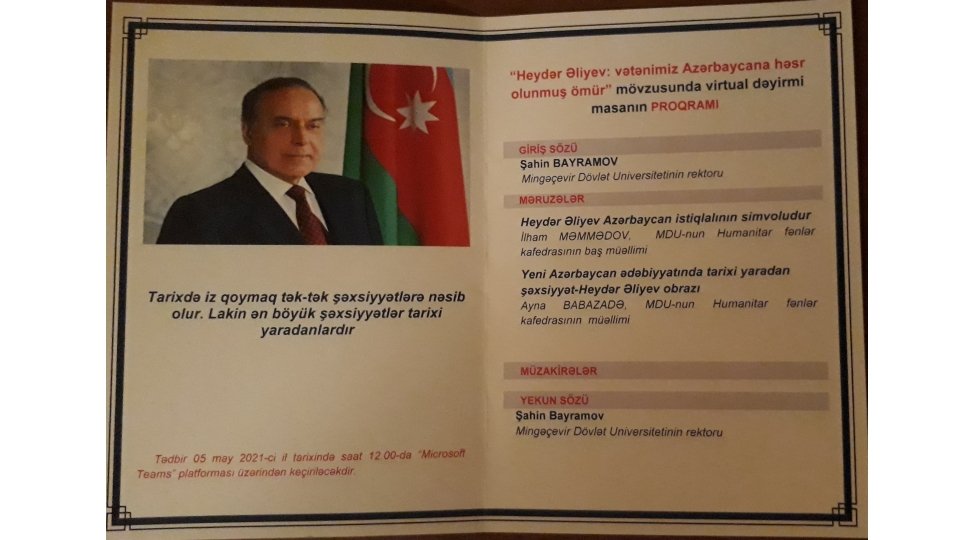 2021-ci ilin 5 may tarixində Mingəçevir Dövlət Universitetində (MDU) Azərbaycan xalqının ümummilli lideri Heydər Əliyevin anadan olmasının 98-ci ildönümünə həsr olunmuş “Heydər Əliyev: Vətənimiz Azərbaycana həsr olunmuş ömür” mövzusunda dəyirmi masa keçirilib.