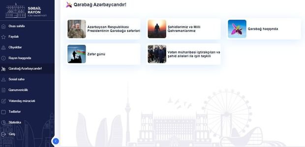 Portalın yeni istifadəyə verilən “Qarabağ Azərbaycandır!” bölməsində Azərbaycan Respublikası Prezidentinin Qarabağa səfərləri, şəhidlərimiz və Milli Qəhrəmanlarımız, Qarabağ haqqında və Zəfər Gününə dair məlumatlar yerləşdirilib.