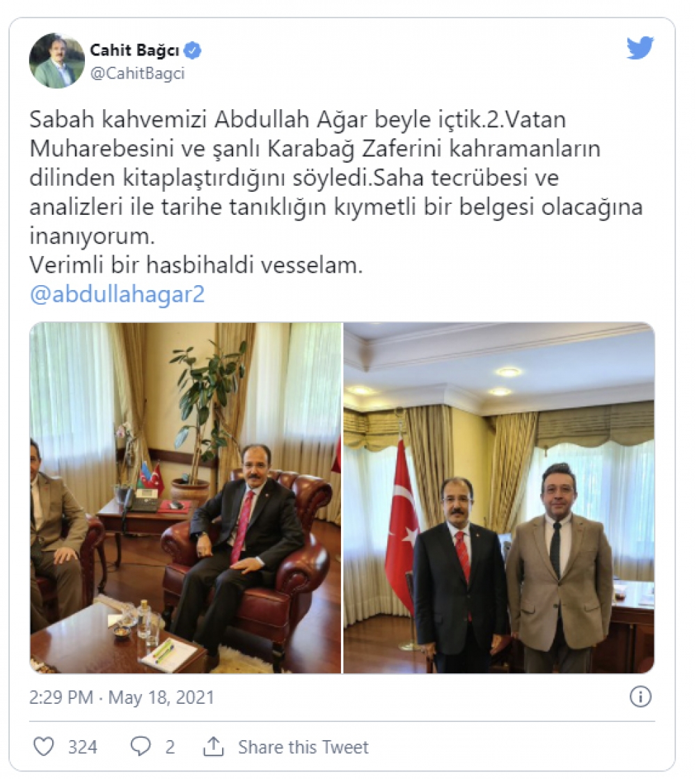 “Səhər qəhvəmizi Abdullah Ağar bəylə içdik. Vətən müharibəsini və şanlı Qarabağ zəfərini qəhrəmanların dilindən kitab halına saldıqlarını söylədi. Müəllifin təcrübəsi və təhlilləri ilə tarixə şahidliyin qiymətli bir nümunəsi olacağına inanıram”, – deyə C.Bağçı bildirib.