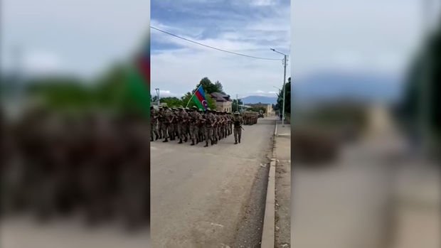 Azərbaycan əsgərləri “Şəhidlər ölməz, Vətən bölünməz”, “Hər şey Vətən üçün” şüarları səsləndirərək sıra addımları ilə yeriyiblər.