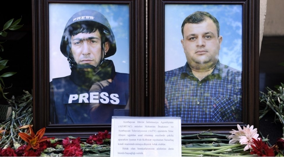 Sonda şəhid jurnalistlər Məhərrəm İbrahimovun və Sirac Abışovun AZƏRTAC-ın binası qarşısında qoyulmuş portretləri önünə gül dəstələri düzülüb.