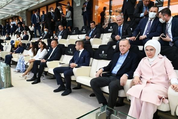 Azərbaycan Respublikasının Prezidenti İlham Əliyev, Birinci vitse-prezident Mehriban Əliyeva, qızları Leyla Əliyeva, ölkəmizdə rəsmi səfərdə olan Türkiyə Respublikasının Prezidenti Rəcəb Tayyib Ərdoğan və xanımı Əminə Ərdoğan oyuna baxıblar.