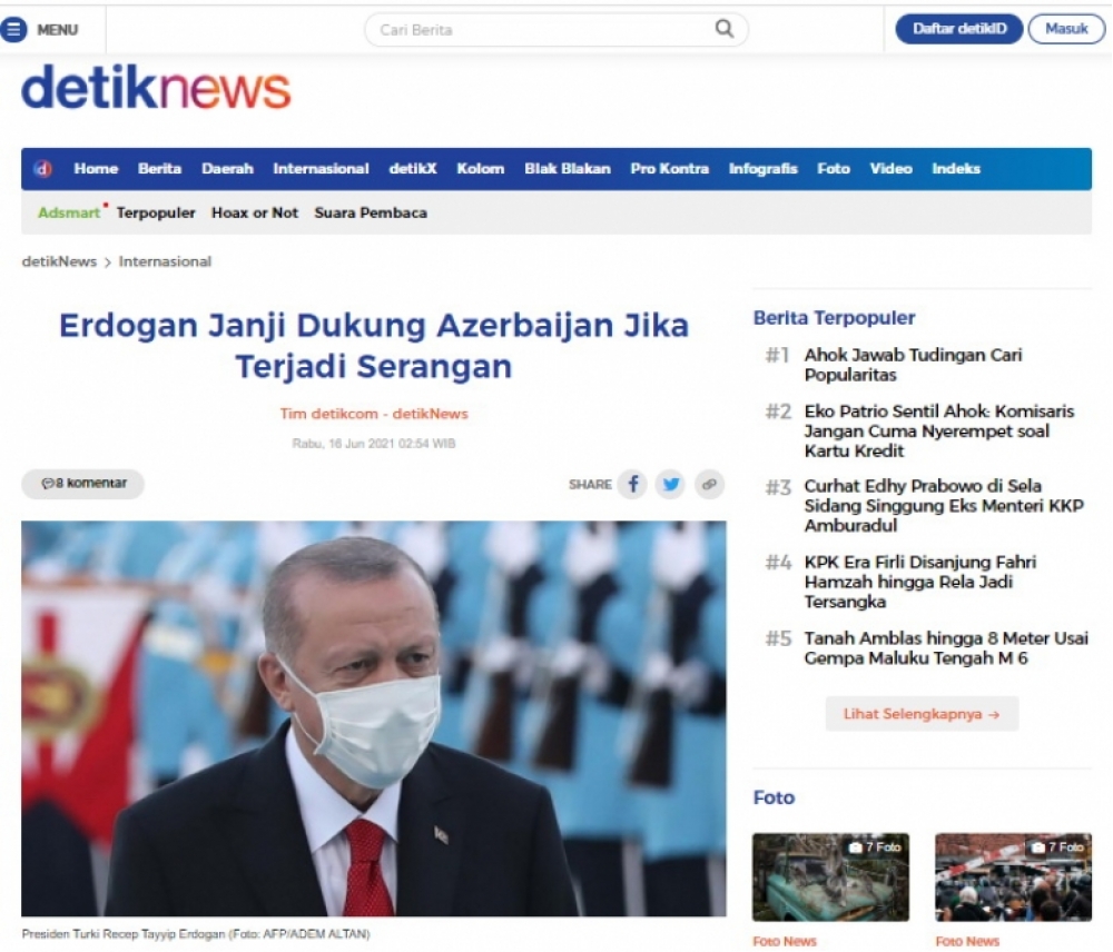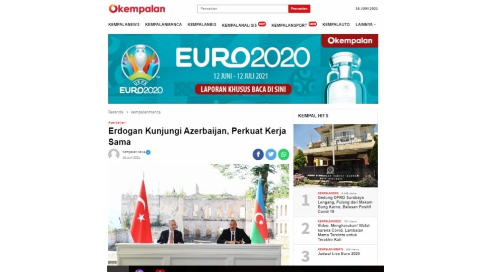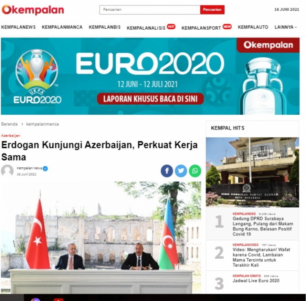 ARANTV.AZ xəbər verir ki, İndoneziyanın “kempalan.com” və “news.detik.com” saytlarının yaydıqları məqalələrdə Türkiyə prezidenti Rəcəb Tayyib Ərdoğanın bir gün əvvəl tarixi Azərbaycan şəhəri olan Şuşaya səfəri barədə ətraflı məlumat verilir. Məqalələrdə Türkiyənin dövlət başçısının Şuşada Prezident İlham Əliyevlə görüşdüyü və əməkdaşlıq barədə Bəyannamə imzaladığı xüsusi vurğulanıb.