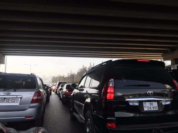 Yolda nəqliyyat vasitələrinin hərəkətində sıxlıq müşahidə edilir.