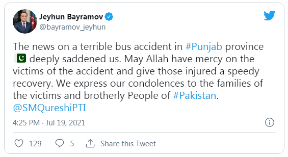 “Pəncab əyalətindəki dəhşətli avtobus qəzası xəbəri bizi dərindən kədərləndirdi. Qəzada ölənlərə allahdan rəhmət, yaralananlara isə tezliklə şəfa tapmalarını arzulayırıq. Ölənlərin ailələrinə, qardaş Pakistan xalqına başsağlığı veririk”, paylaşımda qeyd edilib.