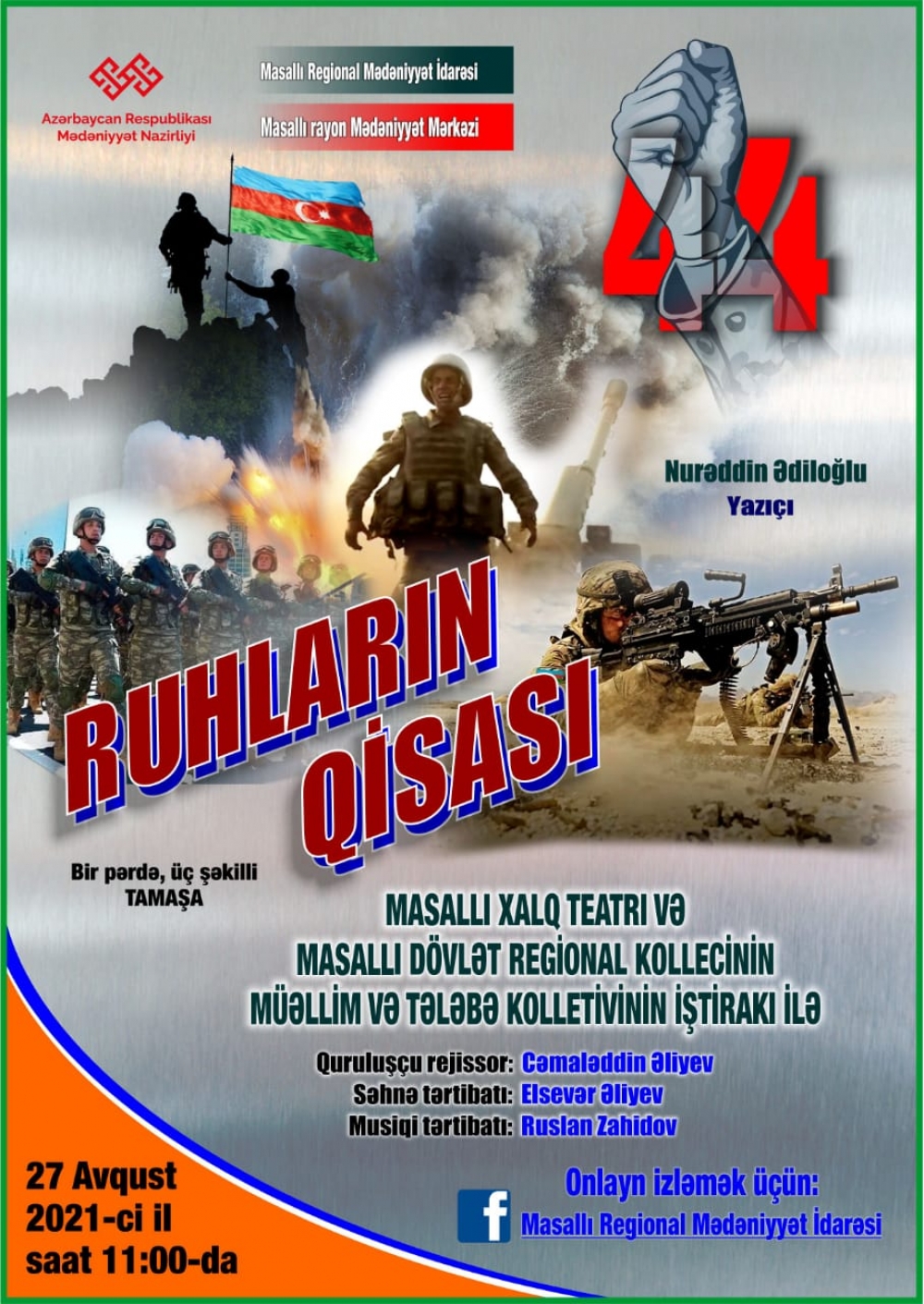 Avqustun 27-də isə Masallı rayon Mədəniyyət Mərkəzində Xalq Teatrının aktyorları Masallı Dövlət Regional Kollecinin müəllim və tələbə kollektivinin iştirakı ilə Vətən müharibəsinin qəhrəmanı İntiqam Əsgərlinin xatirəsinə həsr olunmuş “Ruhların qısası” adlı tamaşanı nümayiş etdirəcək. Tamaşada iki şəhid anası Ziba xanımın rolunu Xalq Teatrının həvəskar aktrisası Aybəniz Həsənova ifa edəcək. Birpərdəli və üçşəkilli tamaşa rejissor Camaləddin Əliyevin quruluşunda təqdim ediləcək. Səhnə əsərinin musiqi tərtibatı Ruslan Zahidov, səhnə tərtibatı isə Elsevər Əliyevə məxsusdur.“Ruhların qisası” tamaşası sosial şəbəkələr vasitəsilə canlı yayımlanacaq.