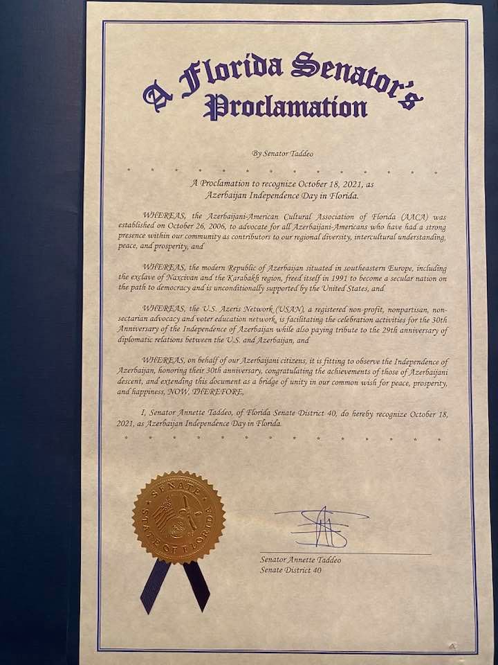 Floridada hər il 18 oktyabr Azərbaycanın Müstəqilliyinin Bərpası Günü kimi qeyd olunacaq