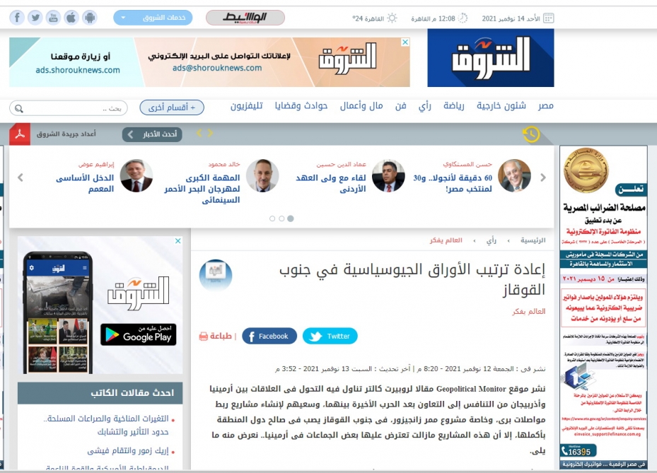 Kanada Qlobal Məsələlər İnstitutunun eksperti Robert Katlerin “Geopolitical Monitor” jurnalında yayımlanmış “Qarabağın inkişafı Cənubi Qafqazda vəziyyəti dəyişəcək” sərlövhəli analitik məqaləsi Misirin “Əl Şuruğ” qəzetində ərəb dilində dərc edilib.