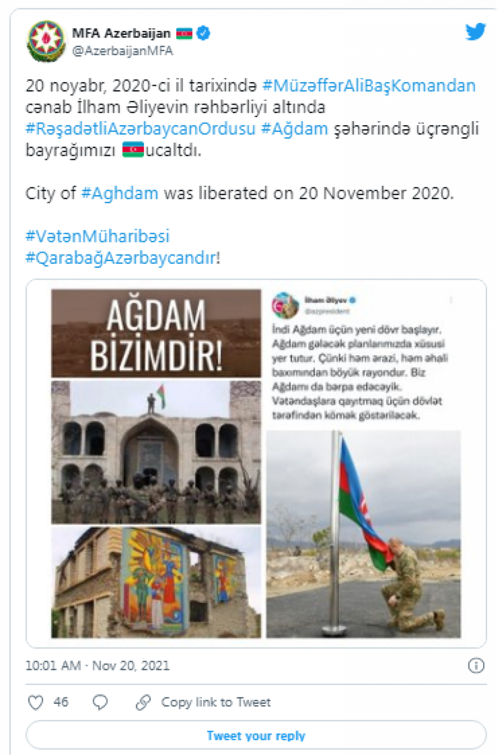 “20 noyabr 2020-ci il tarixində Müzəffər Ali Baş Komandan İlham Əliyevin rəhbərliyi altında rəşadətli Azərbaycan Ordusu Ağdam şəhərində üçrəngli bayrağımızı ucaltdı”.