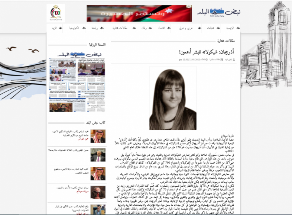 İordaniyanın “Əl Ənbat”, “Şaab”, “Nəbd Əl Balad” qəzetlərində gənc jurnalist Marina Sudanın Azərbaycanın qənnadı məhsulları, xüsusən şokoladı barədə məqaləsi dərc olunub.