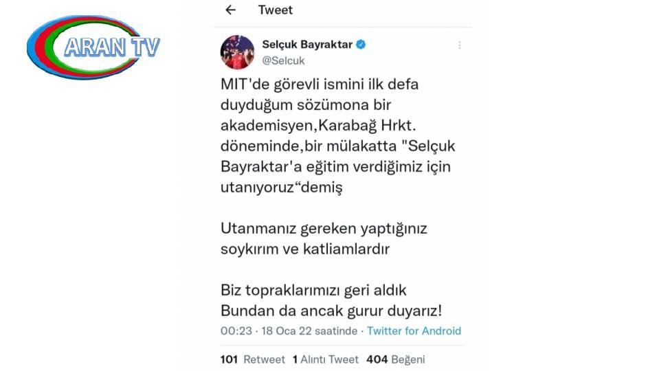 ARANTV.AZ xəbər verir ki, bu fikirləri özünün rəsmi tvitter hesabında Türkiyənin “Baykar” şirkətinin texniki direktoru Səlcuq Bayraktar ölkəsinin Milli Kəşfiyyat Təşkilatının bir əməkdaşının Azərbaycanın Vətən müharibəsi dövründə “Səlcuk Bayraktara təhsil verdiyimiz üçün utanırıq” sözlərinə cavab olaraq bildirib.