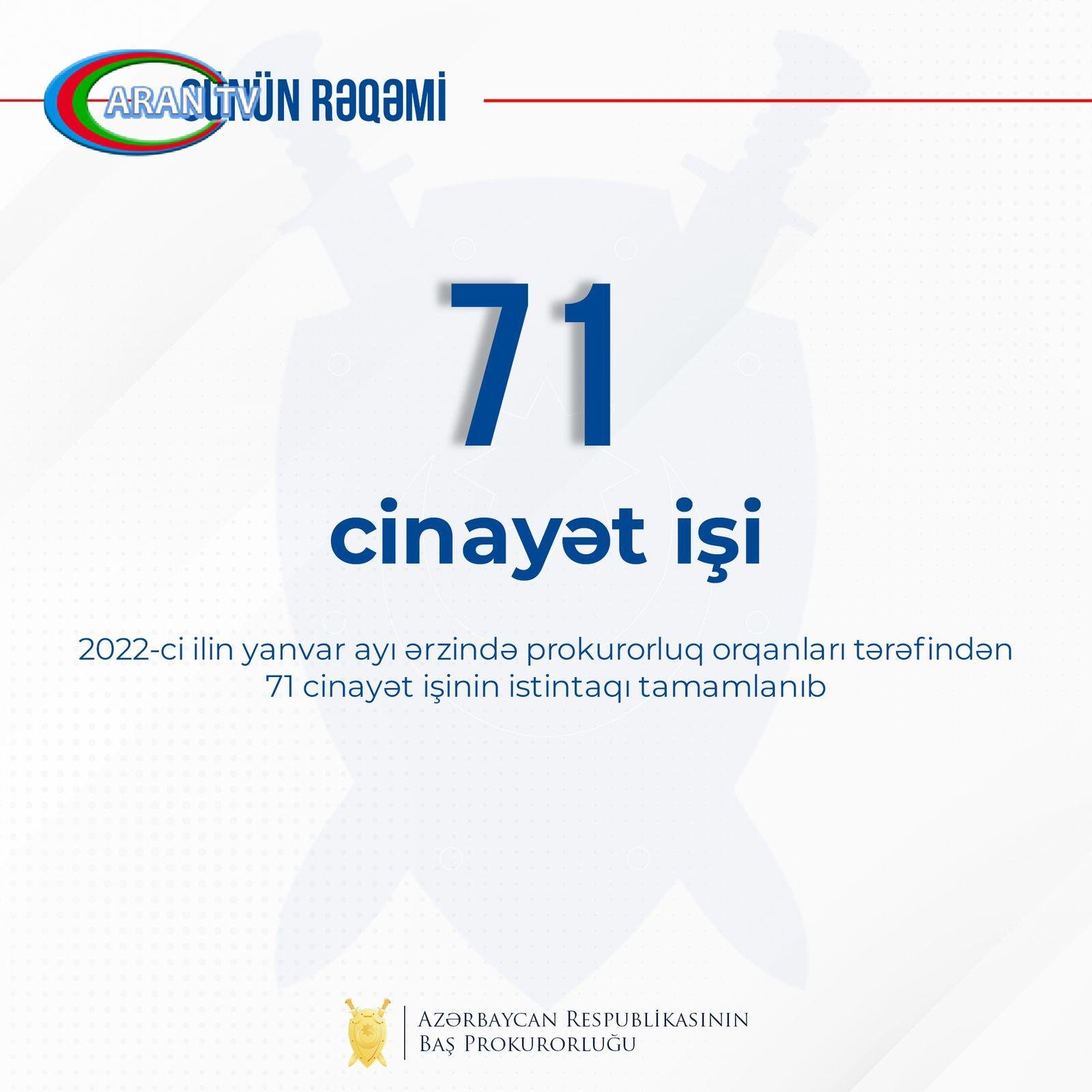2022-ci ilin yanvar ayı ərzində prokurorluq orqanları tərəfindən 71 cinayət işinin istintaqı tamamlanıb