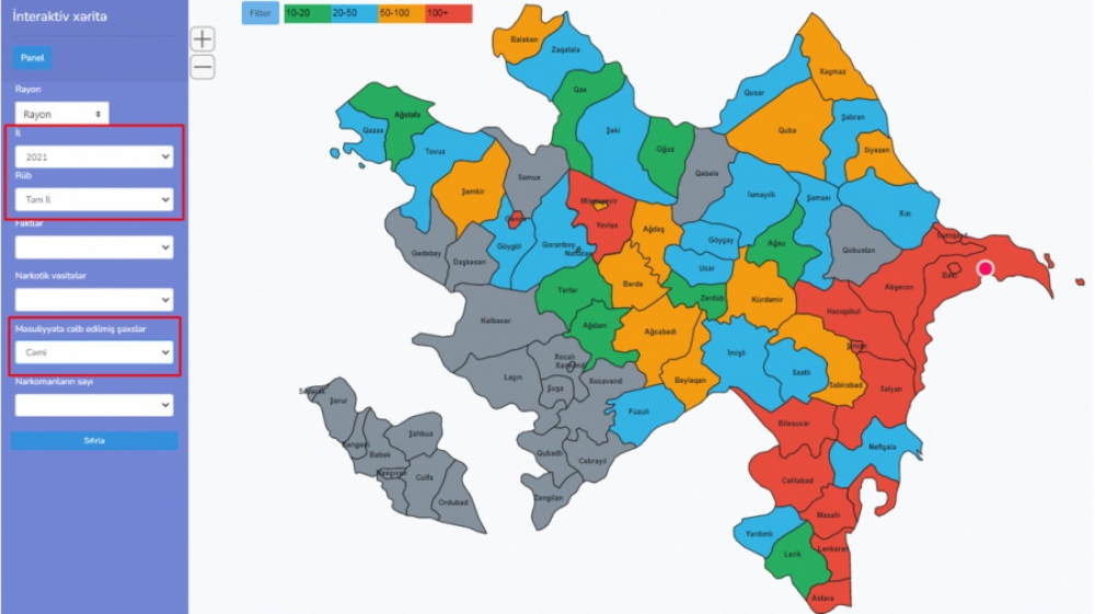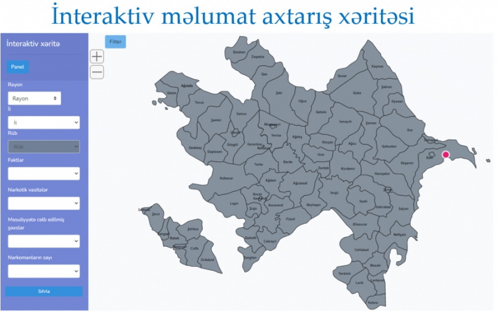 Narkotik vasitələrin qanunsuz dövriyyəsi barədə şəhər və rayonlar üzrə statistik məlumatlara dair interaktiv xəritə hazırlanmışdır.