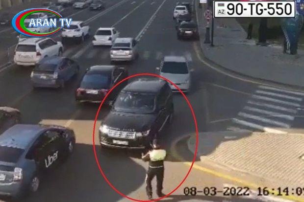 Ərazidə xidmətdə olan yol polisi əməkdaşı avtomobilin qarşısını kəsərkən, sürücü və sərnişin onunla mübahisə etməyə başlayıb. Qarşıda əyləşən xanım sərnişinin qərəzli hərəkətləri kamera görüntülərində aydın şəkildə əks olunub.