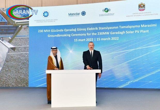 Birləşmiş Ərəb Əmirliklərinin “Masdar” şirkəti tərəfindən Azərbaycanda inşa ediləcək 230 MVt gücündə Qaradağ Günəş Elektrik Stansiyasının martın 15-də Gülüstan sarayında təməlqoyma mərasimi keçirilib.