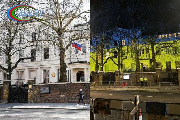 Londonda Rusiya səfirliyinin binası Ukrayna bayrağının rənginə boyandı – FOTO