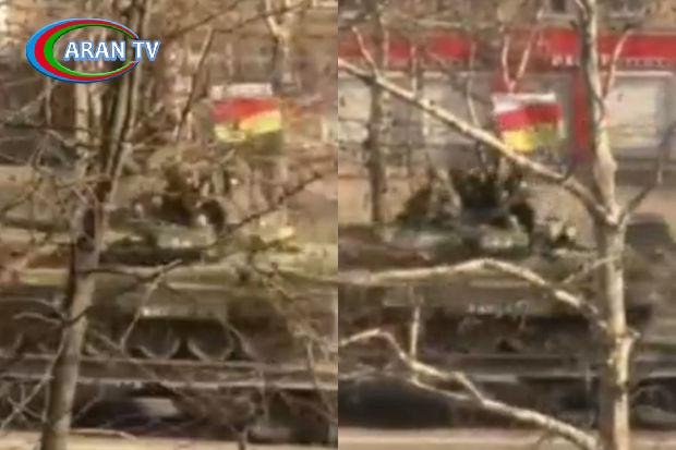 Melitopol şəhərində çəkilmiş görüntülərdə yük maşını vasitəsilə daşınan tankın üzərində Cənubi Osetiya bayrağı dalğalanır.