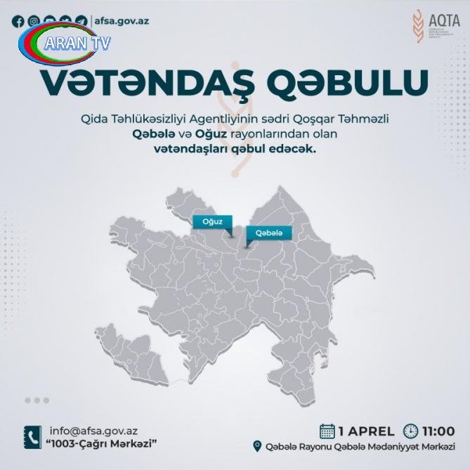 Aprelin 1-i saat 11-də Azərbaycan Respublikası Qida Təhlükəsizliyi Agentliyinin sədri Qoşqar Təhməzli Qəbələ Mədəniyyət Mərkəzində Qəbələ və Oğuz rayonlarından olan vətəndaşları qəbul edəcək.