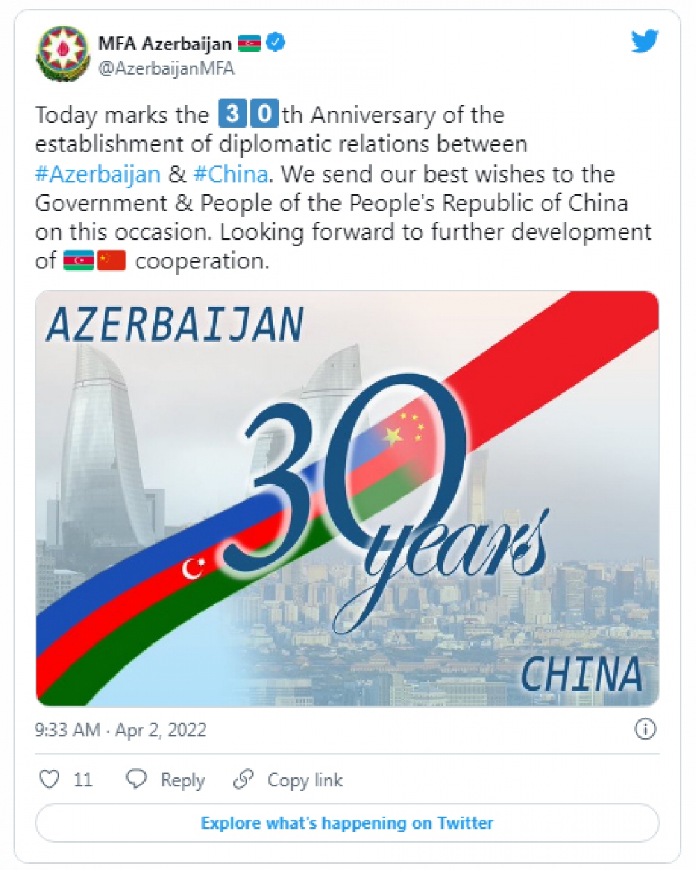 “Bu gün Azərbaycan və Çin arasında diplomatik münasibətlərin qurulmasının 30-cu ildönümüdür. Biz bu münasibətlə Çini hökuməti və xalqına ən xoş arzularımızı çatdırırıq. Azərbaycan və Çin arasında əməkdaşlığın daha da inkişafını səbirsizliklə gözləyirik”, – nazirlikdən bildirilib.