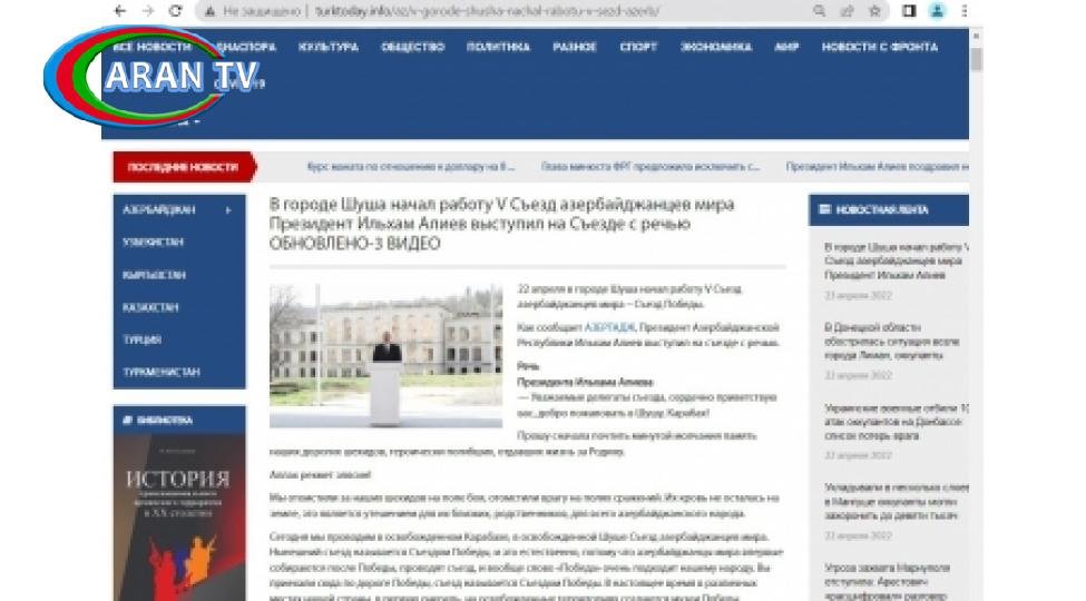 Qırğızıstanın “turktoday.info” portalı öz səhifəsində Şuşa şəhərində Dünya Azərbaycanlılarının V Qurultayı – Zəfər Qurultayının işə başlaması ilə bağlı AZƏRTAC-ın rus dilində yaydığı geniş materialı tam olaraq yerləşdirib.