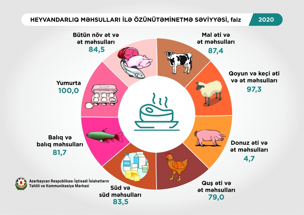 Heyvandarlıq məhsulları üzrə ən yüksək göstərici yumurta (100%), qoyun və keçi əti məhsulları (97,3%), ən aşağı göstərici isə donuz əti və ət məhsullarındadır (4,7%).