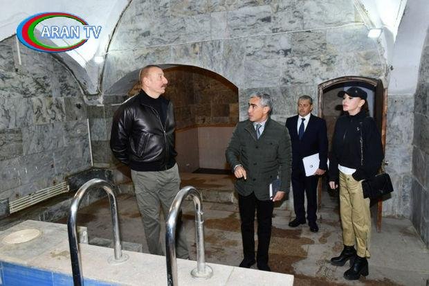 Sonra Prezident İlham Əliyev və Birinci vitse-prezident Mehriban Əliyeva Şuşadakı Şirin su hamamında aparılan bərpa işləri ilə tanış olublar.