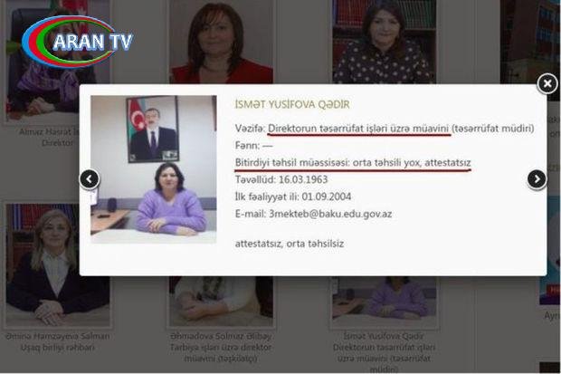 Bir neçə gündür sosial şəbəkələrdə Binəqədi rayonu Rüstəm Əliyev adına 3 nömrəli tam orta məktəbin direktorunun təsərrüfat işləri üzrə müavini İsmət Yusifovanın orta təhsilli olmaması ilə bağlı xəbərlər reaksiyalara səbəb olur.