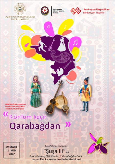İyunun 1-də Şuşada məktəblilər arasında “Şuşa İli”nə həsr olunmuş “Könlüm keçir Qarabağdan” adlı respublika incəsənət festival-müsabiqəsinin yekun konsert proqramı keçiriləcək. Tədbir Təhsil Nazirliyinin təşkilatçılığı, Mədəniyyət Nazirliyinin və Şuşa Dövlət Qoruğu İdarəsinin tərəfdaşlığı ilə Şuşa Real Məktəbinin qarşısında baş tutacaq.