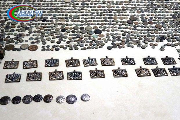 Həmin bağlamalara baxış nəticəsində isə üzərində müxtəlif simvol və heroqlif olan 4 ədəd qızıl sikkə, üzərində müxtəlif simvol və heroqlif olan 20 ədəd gümüş sikkə, bürüncdən hazırlanan – üzərində şamdan simvolu olan 18 ədəd kulon, eləcə də xaça bənzər 22 ədəd kulon, üzərində simvol olan kubşəkilli 5 ədəd predmet, üzərində simvol olan 4 ədəd çoxbucaqlı predmet, üzərində simvol olan 1 ədəd səkkizbucaqlı predmet, üzərində müxtəlif simvollar olan 280 ədəd dördbucaqlı predmet və nəhayət, üzərində müxtəlif simvol və heroqlif olan 10 800 ədəd dairəvi şəkilli mis aşkara çıxarılıb.