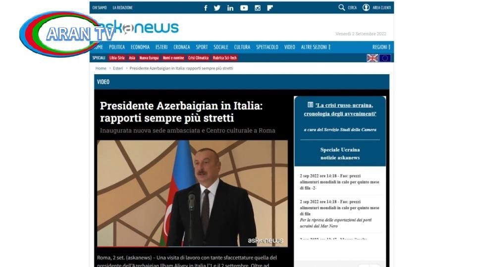 Ölkənin “AGI”, “ANSA”, “Il Sole 24 Ore”, “Askanews”, “il Giornale”, “Yahoo Notizie”, “Giornale Diplomatico”, “Kmetro0” və digər mətbu orqanlarında yayılan materiallarda Prezident İlham Əliyevin Romada Azərbaycanın İtaliyadakı səfirliyinin yeni binasının açılışında iştirak etdiyi, İtaliya-Azərbaycan Universitetinin yaradılması ilə əlaqədar imzalanmış sənədlərin mübadiləsi mərasiminin keçirildiyi bildirilib. Azərbaycanın İtaliyadakı səfirliyinin yeni binasının açılmasının iki ölkənin dostluq əlaqələrinin mühüm nümunəsi olduğu vurğulanıb. Eyni zamanda, diqqətə çatdırılıb ki, İtaliya-Azərbaycan Universiteti üzrə əməkdaşlıq çərçivəsində Azərbaycanın ADA Universiteti ilə İtaliyanın beş aparıcı ali təhsil müəssisəsi – Luiss Guido Carli Universiteti, Romanın Sapienza Universiteti, Turin Politexnik Universiteti, Alma Mater Bolonya Universiteti və Milan Politexnik Universiteti arasında akademik əməkdaşlığa dair imzalanmış sazişlər mübadilə edilib.