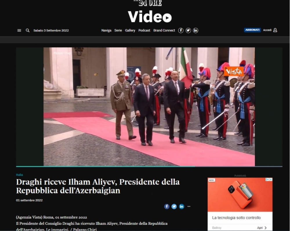 İtaliyanın aparıcı KİV-ləri Prezident İlham Əliyevin bu ölkəyə səfərini geniş işıqlandırıb