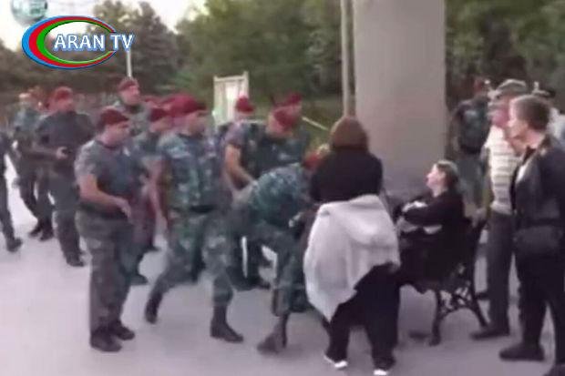 Kadrlarda bir neçə polisin qadını skamyadan qaldırıb sürüyərək polis maşınına apardığı əks olunub.