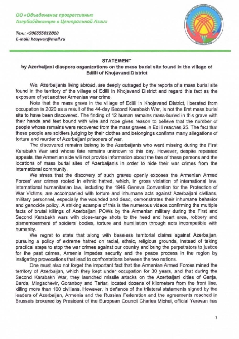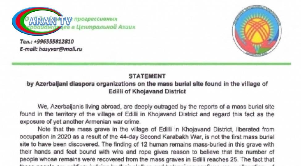 Qırğızıstanda fəaliyyət göstərən Mərkəzi Asiyada Mütərəqqi Azərbaycanlılar Birliyi Xocavənd rayonunun Edilli kəndində aşkar olunmuş kütləvi məzarlıqlarla bağlı beynəlxalq ictimaiyyətə müraciət edib.