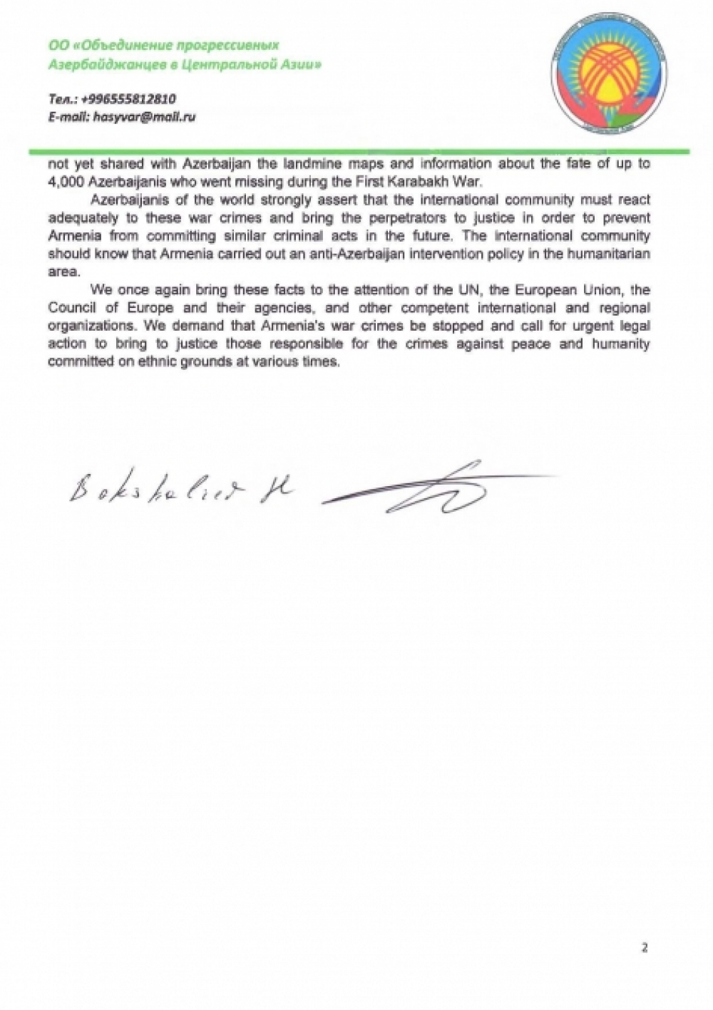 Diasporla İş üzrə Dövlət Komitəsindən “İki sahil”ə verilən məlumata görə, birliyin sədri Xansuvar Baxşəliyevin adından Birləşmiş Millətlər Təşkilatına, Avropa İttifaqına, Avropa Parlamentinə və Avropa Şurasına ünvanlanan müraciətdə Ermənistanın növbəti hərbi cinayətinin ifşası kimi qiymətləndirilən bu hadisənin Bişkekdə yaşayan soydaşlarımızın dərin hiddətinə səbəb olduğu qeyd edilib.