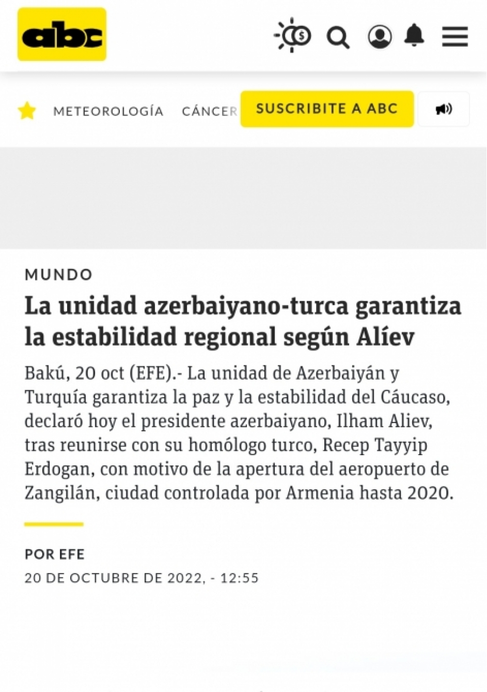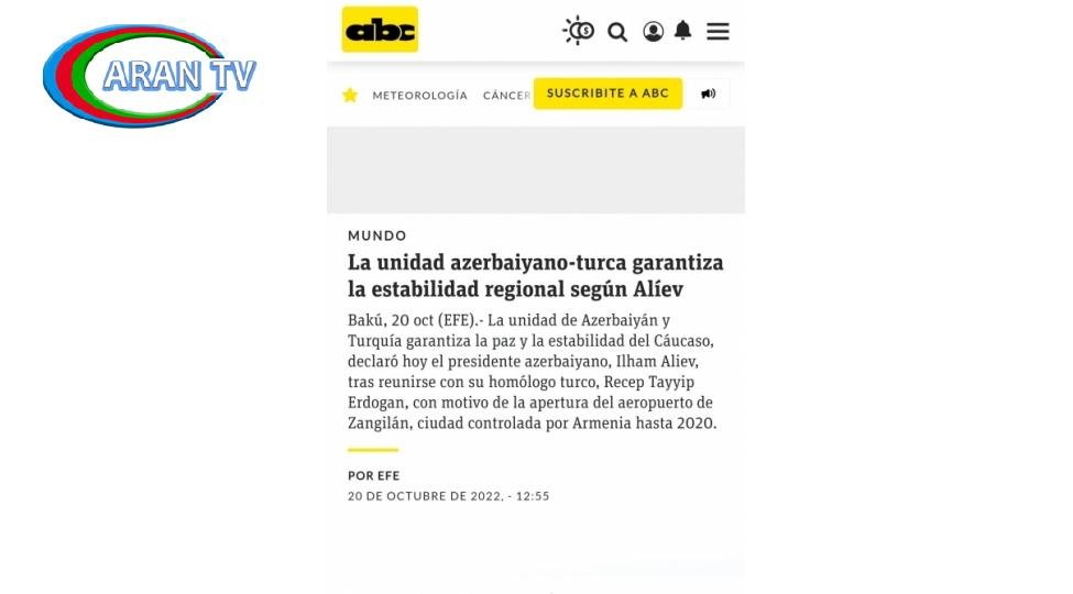 İspaniyanın “EFE” xəbər agentliyi, SWI swissinfo.ch (İsveçrə İctimai Yayım Korporasiyasının (SRG SSR) beynəlxalq onlayn platforması) ispandilli versiyası, Paraqvayın abc.com xəbər portalında “İlham Əliyev: Azərbaycan-Türkiyə birliyi regional sabitliyin təminatıdır” başlıqlı məqalə dərc edilib.