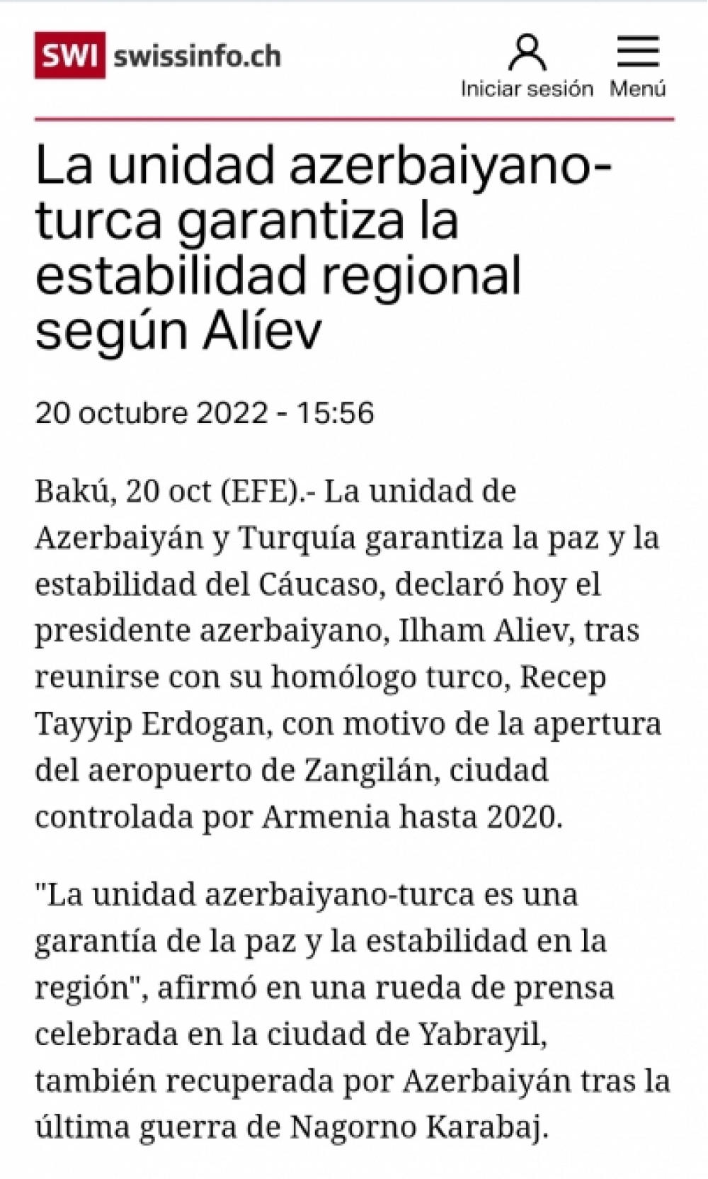 İspandilli nəşrlər yazır ki, oktyabrın 20-də iki lider Azərbaycanın 2020-ci ilin payızında Ermənistanla müharibədən sonra işğaldan azad etdiyi Zəngilanda beynəlxalq hava limanının açılışını ediblər. EFE yazır ki, bu, açılışında Türkiyə prezidentinin də iştirak etdiyi Füzuli hava limanından sonra işğaldan azad edilmiş Azərbaycan ərazilərində tikilən ikinci hava limanıdır.