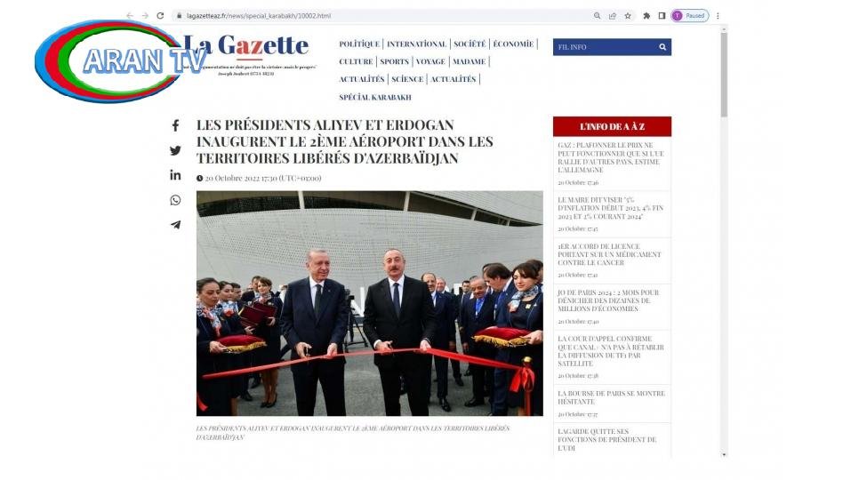 Fransanın “La Gazette”xəbər portalında Azərbaycan Respublikasının Prezidenti İlham Əliyev və Türkiyə Respublikasının Prezidenti Rəcəb Tayyib Ərdoğanın iştirakı ilə oktyabrın 20-də keçirilən Zəngilan Beynəlxalq Hava Limanının açılış mərasimi barədə məqalə dərc olunub.