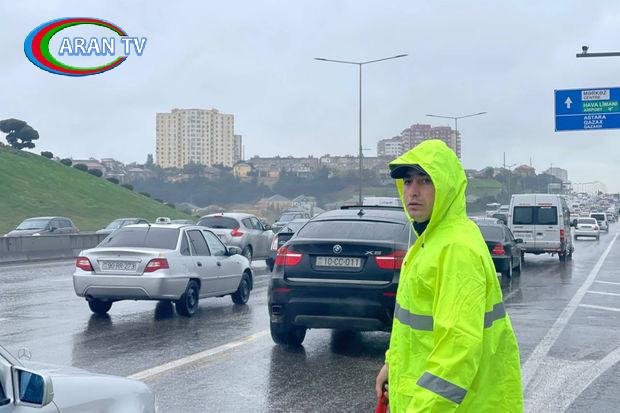 Hava şəraiti ilə bağlı yollarda yarana biləcək tıxacın qarşısını almaq və vətəndaşlarımızın mənzil başına rahat, təhlükəsiz çatmaları üçün polis xidmətdədir.